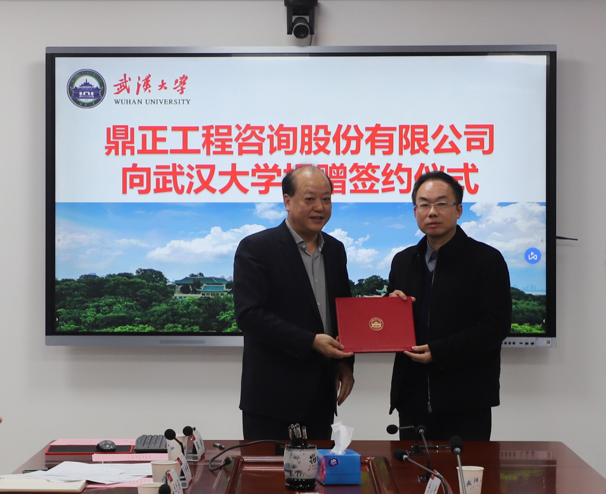 与会人员观看了鼎正工程咨询股份有限公司宣传片,我校党委常委、副校长李资远与鼎正工程咨询股份有限公司副总经理彭亮签署捐赠协议,并向董事长王雁然颁发捐赠证书。
