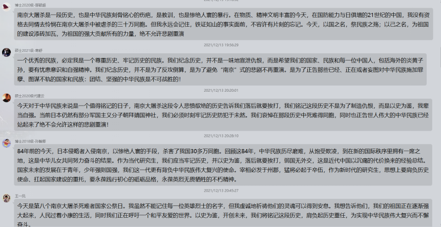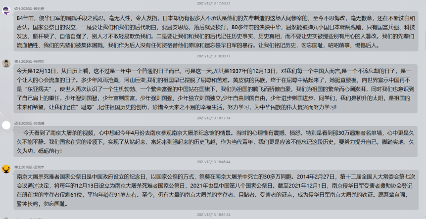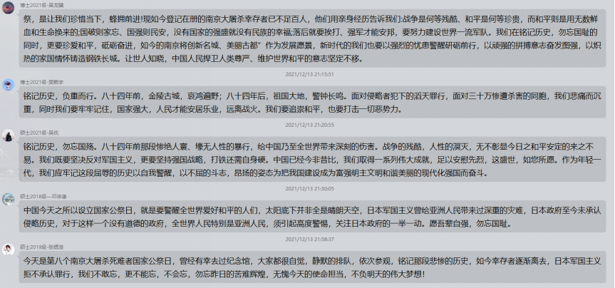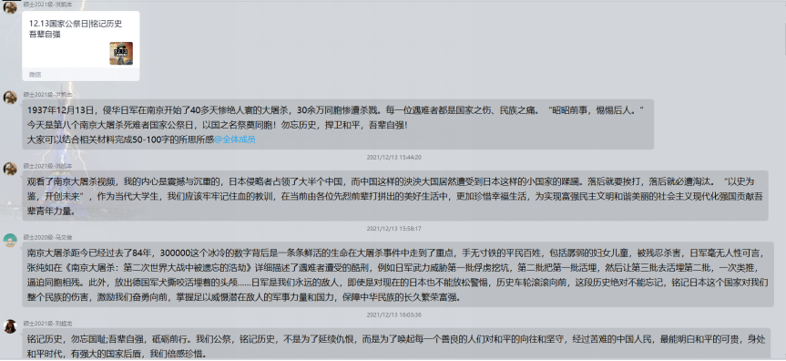 1937年12月13日,侵华日军在南京开始了40多天惨绝人寰的大屠杀,30余万同胞惨遭杀戮。每一位遇难者都是国家之殇、民族之痛。“昭昭前事,惕惕后人。”在第八个南京大屠杀死难者国家公祭日,以国之名祭奠同胞!勿忘历史,捍卫和平,吾辈自强!对此,支部内各位同志发表了自己的感悟。