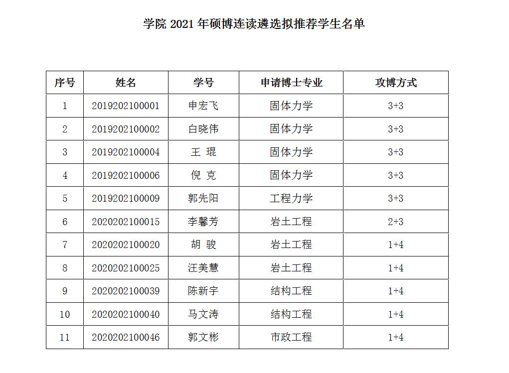 根据研究生院《关于组织学术型硕士研究生中期考核及硕博连读考核的通知》要求,经研究生本人申请、资格审核、综合考核,学院招生领导小组讨论决定拟推荐申宏飞等11位同学为硕博连读研究生。现将名单予以公示,公示期5天。