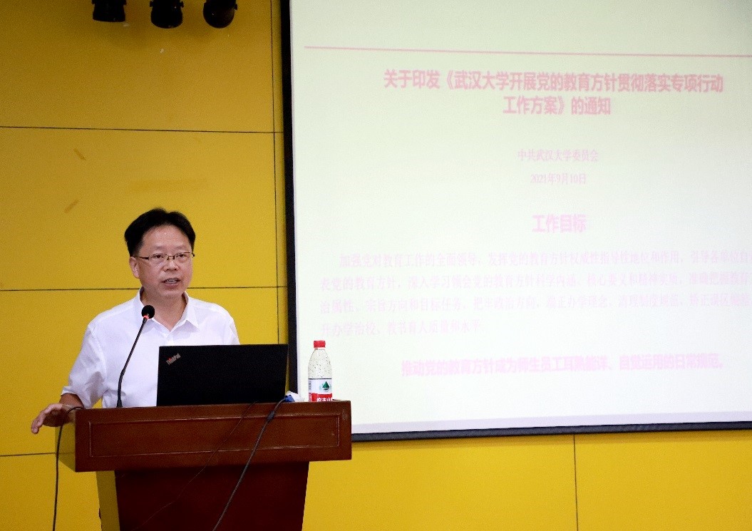 党委书记杨旭向全体教职工作题为《加强党的建设,落实立德树人根本任务》的报告,并对近期党建工作进行了布置。他强调,推动党的教育方针应成为师生员工耳熟能详、自觉运用的日常规范。他进一步强调党支部要发挥党的基层组织战斗堡垒作用,党员要发挥先锋模范带头作用,并将“两个发挥”落实在立德树人的各个环节。他指出,“我为群众办实事”是推进党史学习教育的主题要求,要深入推进班级导师和烛光导航师工作,将党建与立德树人融为一体。他带领全体教职工学习了新时代高校教师职业行为十项准则,抓好党风廉政建设,以党建带团建,促进班风学风建设。