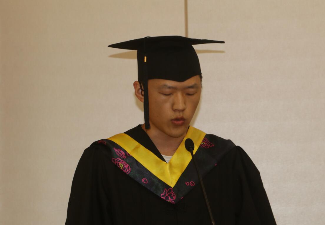 毕业研究生代表常江芳、毕业本科生代表赵志欣作了热情洋溢而又满怀深情的发言,他们回顾了自己在武大求学、生活的经历,细数几年来母校发生的种种变化,表达了对学校、学院、恩师和同窗的感激之情,流露着对母校的眷念、对老师的敬爱、对同窗的不舍……两位学子深情祝福学院的发展越来越好,表示将怀揣远大理想,坚守心灵净土,再创佳业伟绩,不辜负母校和恩师的厚望。