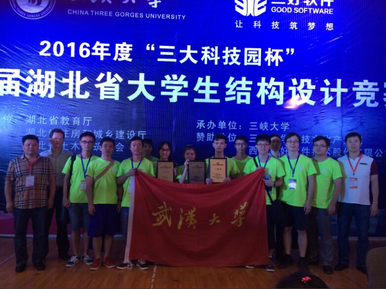 2016年7月17日下午六点,“三大科技园杯”第四届湖北省大学生结构设计竞赛闭幕式于三峡大学大学生活动中心划上了圆满句号。本次竞赛自2016年5月28日我校第九届大学生结构设计竞赛选拔出省赛队伍开始,通过近一个月的积极筹备,在杜新喜、余敏、池寅、袁焕鑫等指导老师的精心指导下,我院三支队伍均取得了较好成绩。2013级梁峻海、袁小杰、郑永坤完成的作品“磐石坝”荣获一等奖,胡煊、魏笛、肖诗颖完成的作品“筑波万里”和吴杨威、杨信美、梁旭宇完成的作品“水波不兴”均荣获二等奖。