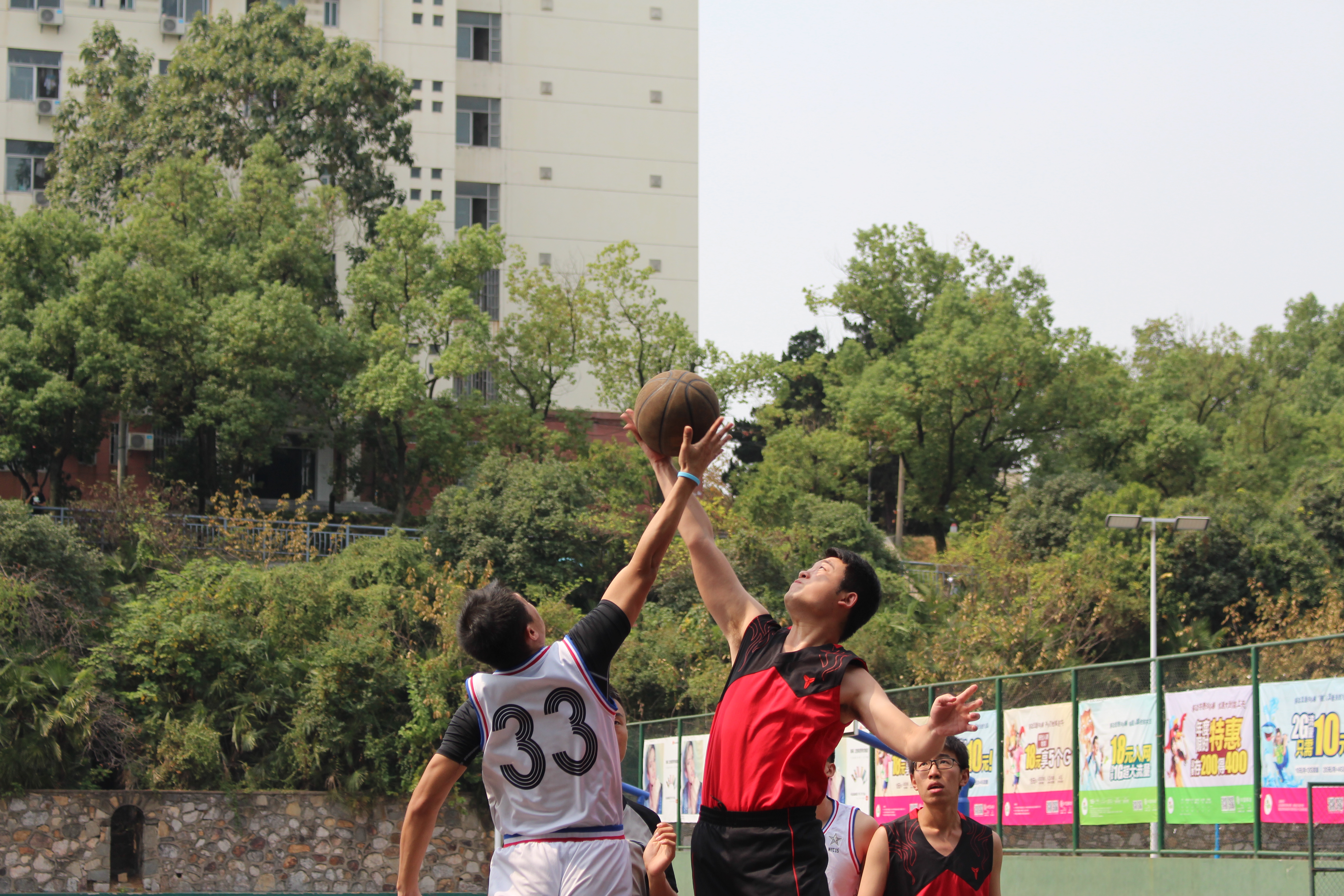 决赛在中午上演,娇阳如火般炙烤着大地,但这丝毫没有影响球员和观众的热情。在球场上,队员们相互配合,组织进攻,奉献给观众一个又一个精彩进球,“注意防守!”、“传球!”场上声嘶力竭的呐喊传来,队员们投球的精准、传球的默契让观众连连称赞。“好球!”、“加油!”场下的后援呼喊着为队员们助威。男队中场休息时,女生以定点投篮形式展开比赛,比赛场面虽没有男队比赛时那么激烈,但同样扣人心弦,精彩万分。比赛过程中,裁判组秉公执法,严肃、认真,尽自己最大的努力判决好每一个球,保障了比赛的公证性、连续性和观赏性。为了保证比赛的顺利进行,各班队员和同学也顾大局,识大体,服从裁判,赛出风格,赛出水平,充分展现我院研究生良好的精神面貌和全面发展的优秀素质。