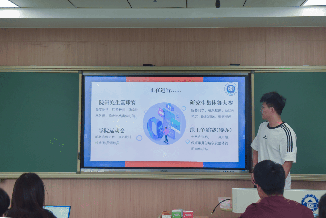 王忠慧同学介绍了文体部的工作规划,详细说明了各类比赛活动及当前人员分工与工作的重难点。同时,文体部正在开展院研究生篮球赛、集体舞大赛,呼吁同学们踊跃参与,丰富学业之余的校园生活。