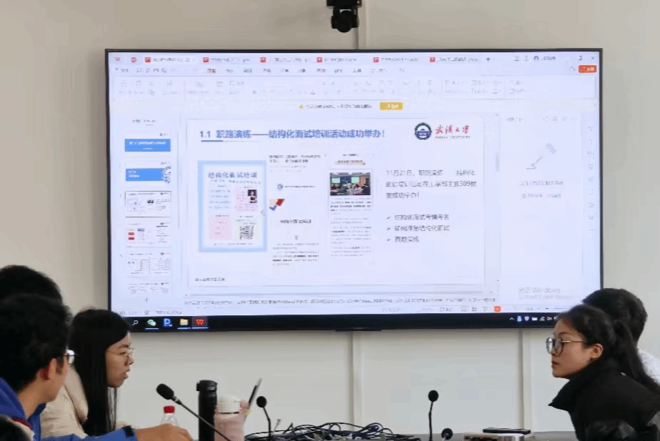接下来,就业指导部负责人龚媛媛同学汇报了就业指导部的工作情况。就业指导部近期举办了结构化面试培训活动,有效提升了同学们的结构化面试能力;收集秋招就业信息并发布第三、四期就业信息整理汇总,并在“武大土建24届就业实习群”更新就业信息,帮助毕业年级同学更好地了解就业信息。就业指导部后续将继续发布秋招就业信息,并组织就业经验分享,帮助解决同学们的就业困惑。