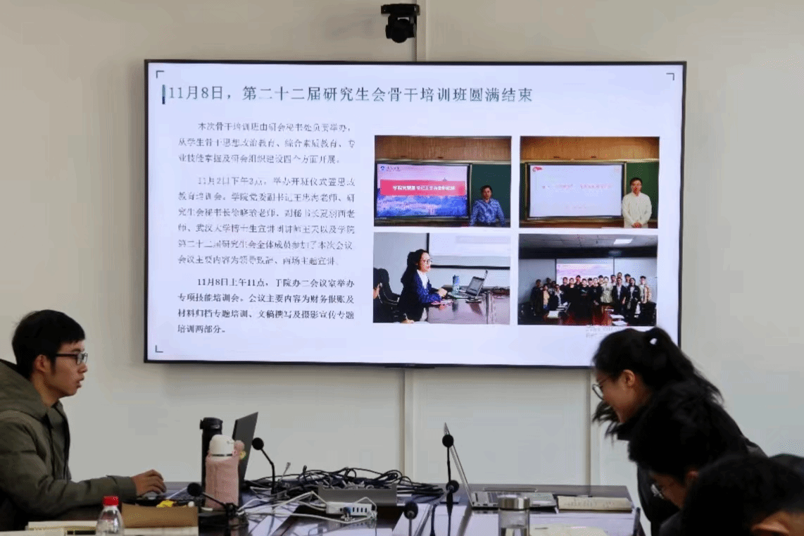 接下来,各部门轮流进行工作汇报。首先,秘书处负责人刘静同学进行汇报。秘书处近期举办了第二十二届研究生会骨干培训班,有效提升了研会成员的思政水平、专业技能水平与综合素质;完成了“我心目中的好导师”评选活动的线上线下宣传工作,彰显了土建学院师生的精神风貌;积极与研会各部门对接,为近期活动的报账做好保障工作。
