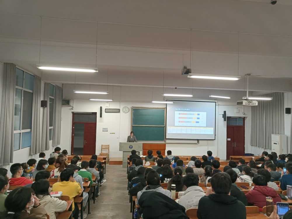会议进行到第三项,2019级辅导员杨荷老师结合同学们进入大学以来的学习成绩进行学习分析,包括各班级成绩比较分析、全年级成绩分析等,让同学们能够看清楚自己目前成绩所处的位置,早日为未来做好准备。杨老师重点介绍了2019级学业预警情况,并强调相比于整体成绩分析,更重要的是每位同学要针对自己的成绩进行认真分析,尤其是挂科严重的同学,要及时修回所欠学分。作为本学期的第一次年级大会,杨老师也强调了本学期的日常工作,着重强调了与疫情相关的晚点名、疫情排查、发热报备、出校审核、核酸检测、疫苗接种等重要事务;此外介绍了学风建设工作、日常安全管理,引导同学们要主动关注自己的心理健康、积极参与集体活动、重视自身思想上的发展与成熟等等。此外,杨荷老师精心准备了彩蛋环节,涉及本校学生毕业后去向的落实率和我校就业信息指导与服务的介绍,她向大家推荐阅读学校发放的2022届毕业生就业指南,提醒大家要把握住学校提供的资源和信息,及时做好职业生涯规划。